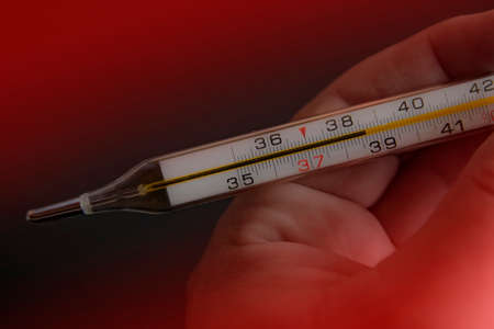 Hand with a thermometer with a high temperature of 38.6 degrees. The red gradient draws attention to dangerous temperatures. The symbol of the threat. Concept of the disease