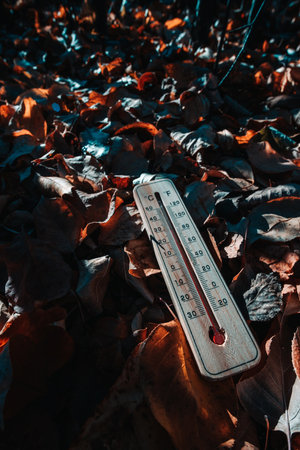 Thermometer on the ground covered with fallen leaves in the forest