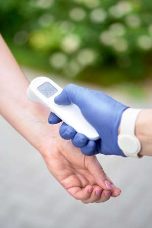 Hand in glove hold thermometer gun on beige background