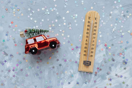 Thermometer shows low plus temperature and Christmas decoration on white and blue with stars festive background. Winter and holiday weather concept, copy space