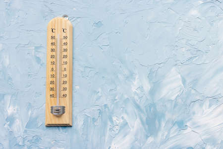 Thermometer shows low temperature on white and blue background. Winter and holiday weather concept, copy space