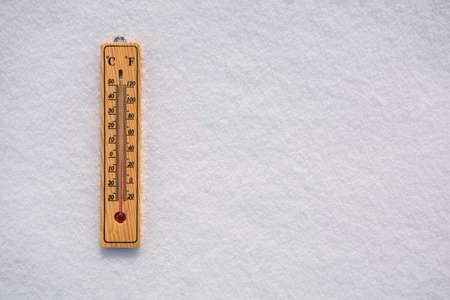 Celsius and Fahrenheit thermometer on the surface of white pure snow. Copy space