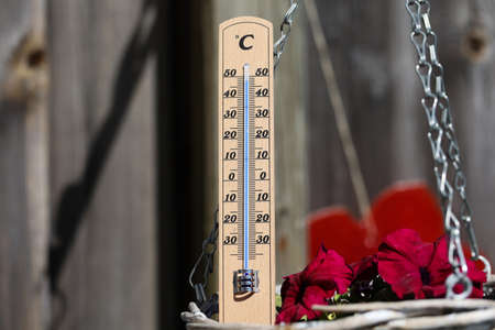 Wooden thermometer with red measuring liquid showing high temperature over 32 degrees Celsius on sunny day on old wooden background. Concept of heat wave, warm weather, global warming, climate change