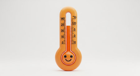 This 3D rendered showcases an orange thermometer with a rounded bulbous base displaying a simple, smiling face with closed eyes. The thermometer tube holds a red liquid at a moderate level, indicated by dual Celsius and Fahrenheit scales. The clean, isolated presentation on a white background emphasizes its playful and approachable educational or conceptual use.