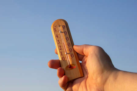 Wooden thermometer with Celsius scale in a mans hand on a white background