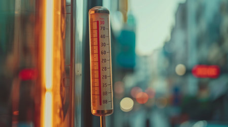 Close-up of a thermometer showing high temperature readings against a blurred urban background.