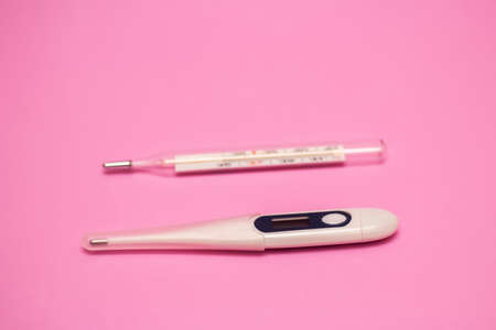two thermometers, one mercury and the other electronic on a pink background
