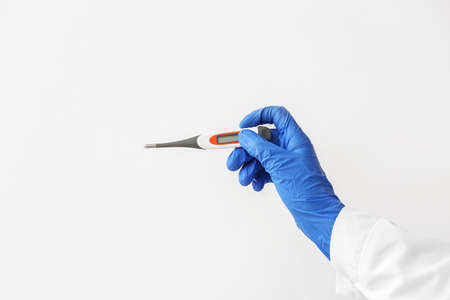 Hand of doctor with electronic thermometer on light background