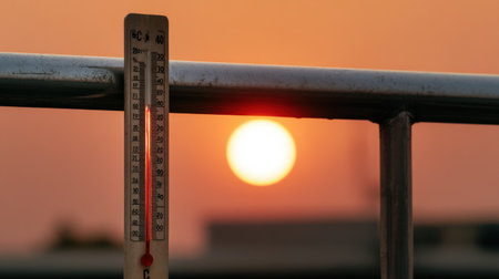A thermometer is on a metal pole next to a sun. The sun is setting and the thermometer is red