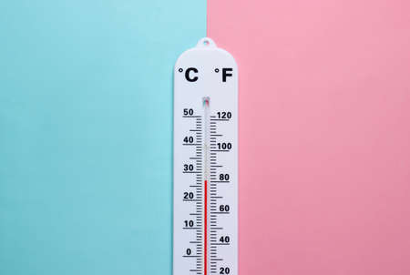Weather thermometer on a blue-pink pastel background. climate control. top view