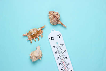 Weather thermometer with seashells on blue pastel background. climate control. top view
