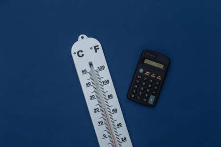 Weather thermometer and calculator on classic blue background. Color 2020. Tiop view