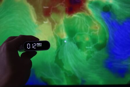 measuring air quality. particulate matter 2.5 (pm.2.5) sensor. harmful small dust detector indicated healthy acceptable air quality. blur background of Thailand southeast asia air quality map.