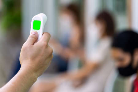 Closeup of hand hold thermometer with background of customer sit in social distancing chair and wait for their call. New normal restaurant concept.