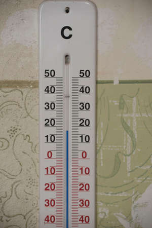 low temperature on the thermometer in winter. The energy crisis in Europe. 16 degrees Celsius room temperature. mercury thermometer on the background of a radiator and a window .