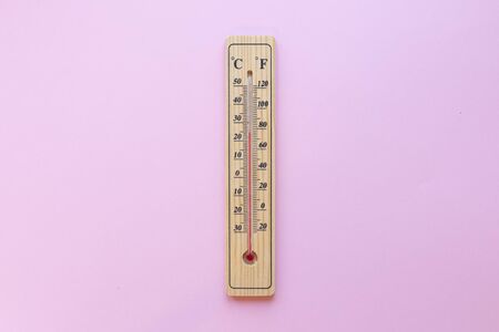 Wood thermometer calibrated in degrees celsius on the wooden wall, concept of world hot and weather.