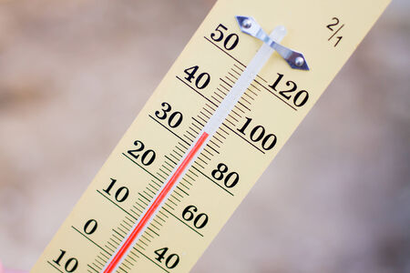 Heat, thermometer shows the temperature is hot in the sky, Summer