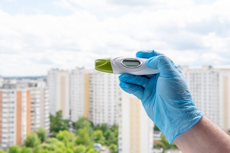 A hand in a protective glove holds an electronic non-contact thermometer. Temperature Measurement Device on white background