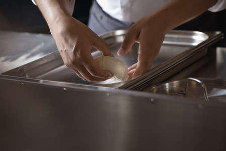 Making dough for bread by male hands in restaurant kitchen. Cooking concept.
