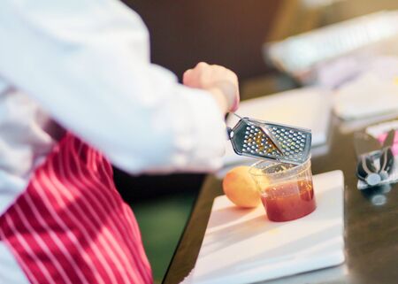 Master class in the kitchen. The process of cooking. Cook puts ingredients into a blender. Step by step. Tutorial. Close-up