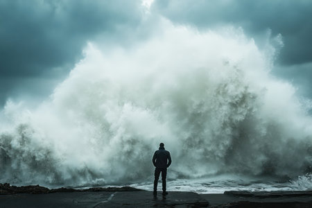 Fearless man standing tall against a massive storm wave, symbolizing courage, strength, and defiance of nature's forces.
