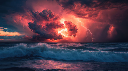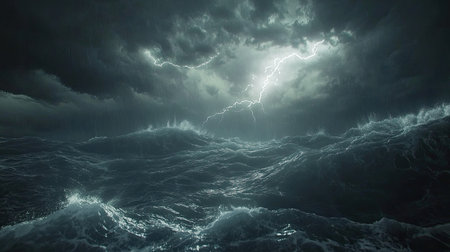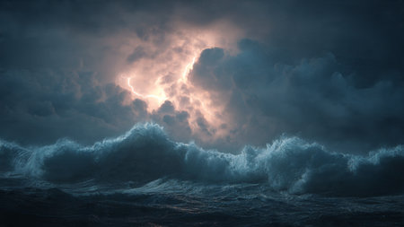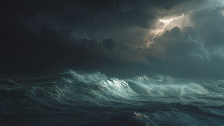 Turbulent ocean waves crash violently under a dark, stormy sky with dramatic lightning illuminating the chaotic...