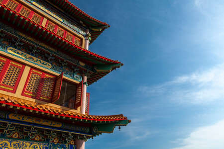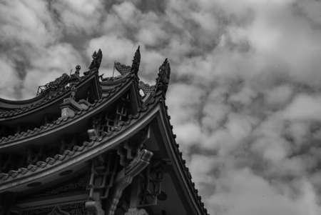 Bangkok, Thailand - 18 Aug 2019 : Traditional patterns of the ancient Chinese Temple roof at Wat Bhoman Khunaram (Bhoman Khunaram Temple).
