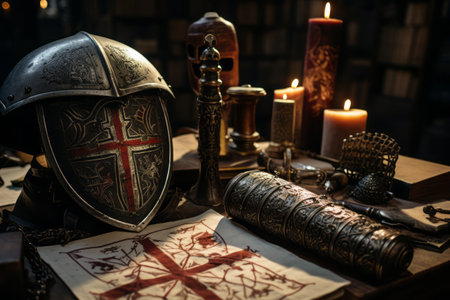 A collection of images showcasing authentic artifacts from the Knights Templar era, such as swords, armor, and ancient manuscripts. Generative Ai