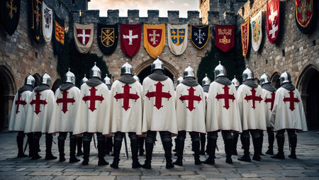 Group of medieval knights templar wearing white capes with red crosses, standing in front of a castle with banners.