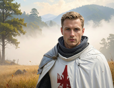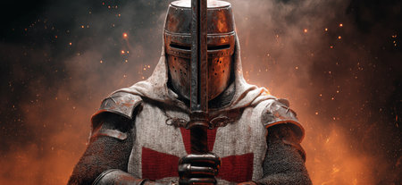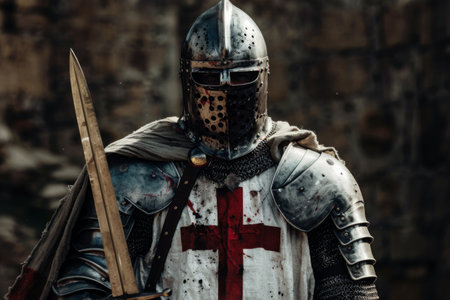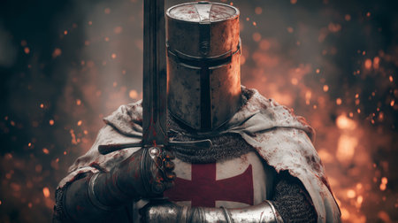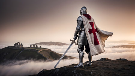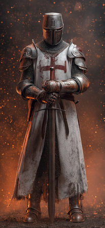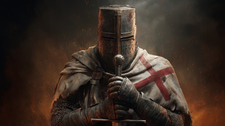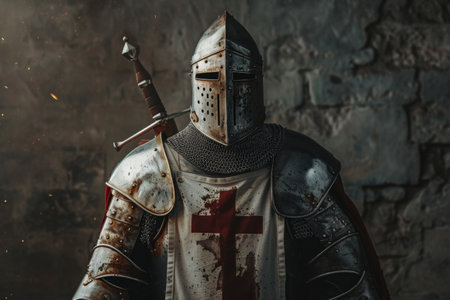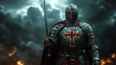 A valiant knight, clad in chainmail and armor, holds a sword and a shield featuring a red cross, embodying the spirit of medieval chivalry and valor.