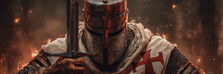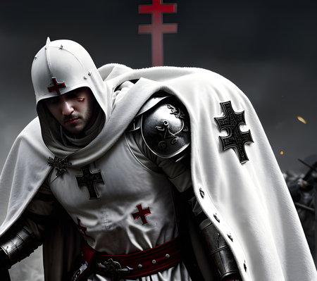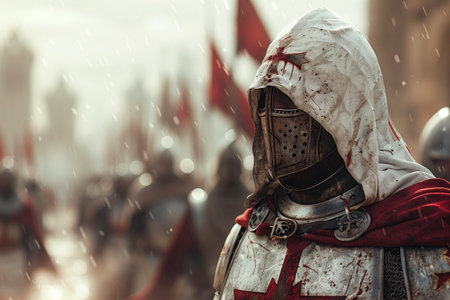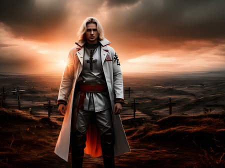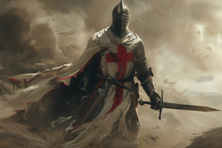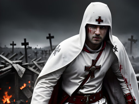Crusader in white coat crosses blood battlefield detailed cinematic H Generative AI Generated