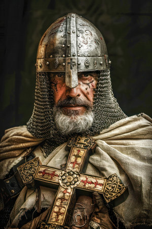 Intense portrait of a weathered Templar knight in battle-worn armor, holding a wooden cross with determination.