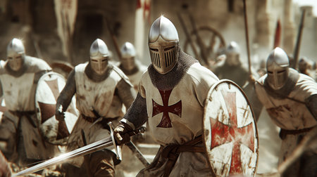 Crusader in white crossadorned coat battles in HD resolution with intense Generative AI Generated