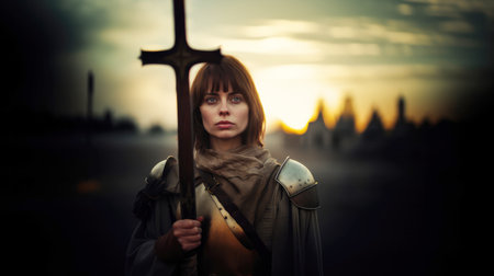Joan of Arc, God's Warrior. Short haired young woman in armor at sunset holding a Cross
