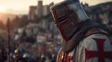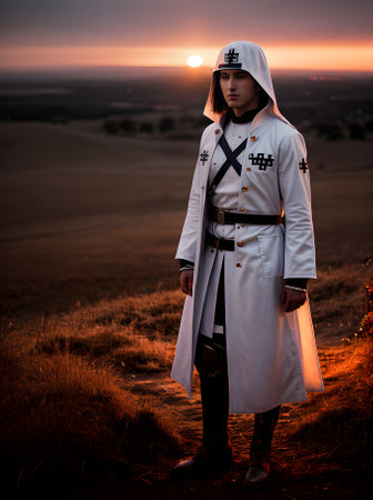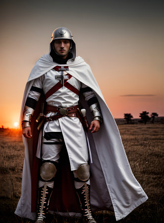 A cinematic detail of a crusader in a white crosscoat battling at sunset Generative AI Generated