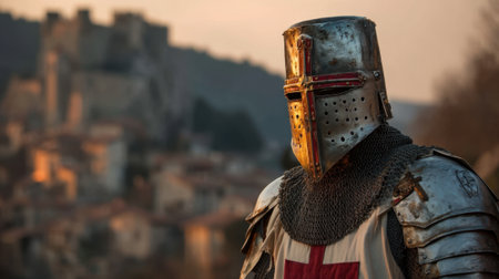 A knight in armor stands near an ancient castle during sunset. The knight wears a helmet and a shield. The warm light highlights the historic details of the scene.