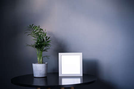 Empty light grey frame, small Areca Palm home plant in a concrete pot on black table with dark gray wall background. Mockup. Modern minimalist interior design. Copy space, selective focus