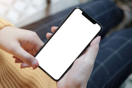 Top view Woman sitting and holding blank screen mock up mobile phone