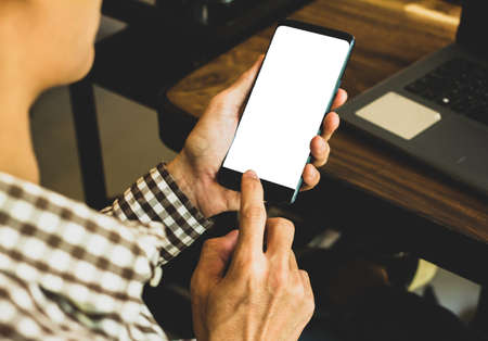 Close up hand holding mockup device of smartphone blank white screen. top view