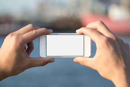 Take a mobile picture on your phone seashore. Female hands hold the phone and take pictures. Travel photography.