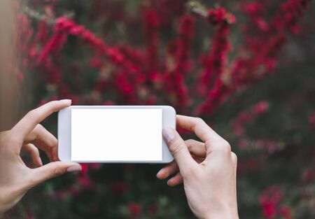 Hipster photograph on smartphone or technology, mock up of blank screen. Girl using cellphone on red flowers background. Hands holding gadget on blur. Mockup front view, space for text message