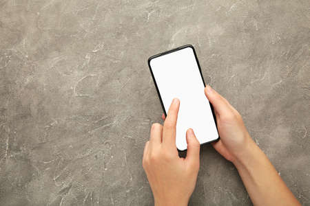 Woman hand holding the black smartphone with white screen on gray background. Top view.