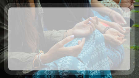 Photograph of the hands of people sitting in a lotus pose at an Indonesian ceremony handed over by aromotic sticks and baskets with flowers in a transparent window