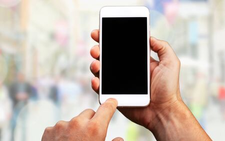 male hand holds a smartphone with a blank screen on the background of a street cafe