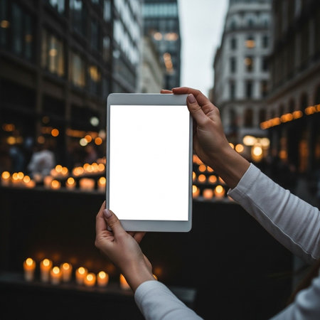 Tablet screen glowing as a hand swipes through a catalog of visuals, symbolizing modern digital interactions