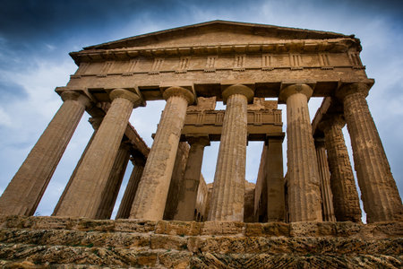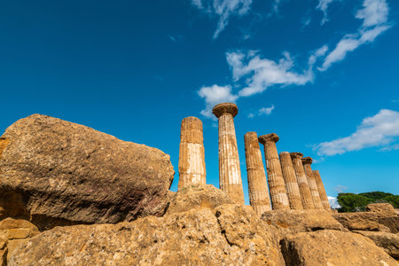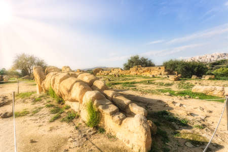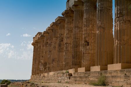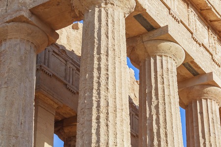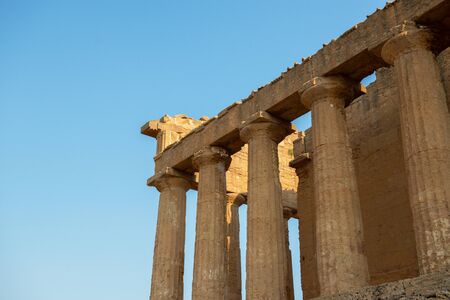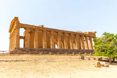 Valley of the Temples (Valle dei Templi), an ancient Greek Temple built in the 5th century BC, Agrigento, Sicily. Famous tourist attraction in Italy. Old marble columns of the Doric order. Travel destination