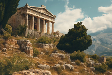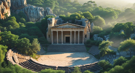 AI Generated. Ancient Theater Surrounded by Lush Greenery and Rocky Landscape