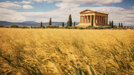 Greek temple in tall wheat field golden crops extend to horizon