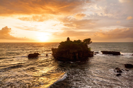 Pura Tanah Lot, the water temple, in Bali at sunset. It is one of the most popular of tourist attraction. Indonesia. Nature landscape background of travel trip and holidays vacation in Indonesia.