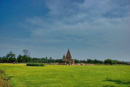 Chennai, South India - October 28, 2018: Wide angle shot of Mahabalipuram shore temple, Ancient India archaeological ruin and it's remaining stone carved structure against clear blue sky